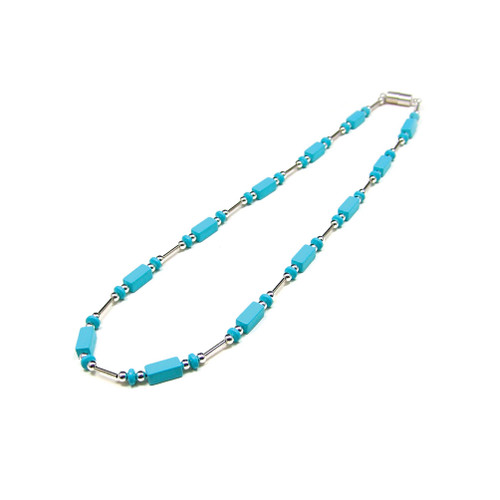Accentskingdom.com introduces a slick stylish magnetic hematite necklace, the piece is set with simulated cubic turquoise magnetic hematite beads(1/5"), small accent beads and a strong magnetic clasp enclosure which will hold this fabulous piece in style. Each magnetic bead is charged with Approx. 600-700 gauss magnetic power. It measures 18" in length and 1/5" in width.
